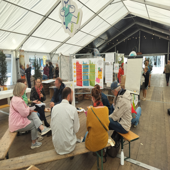 Une première se tient 11h. On termine les derniers préparatifs. Accrocher un panneau, trouver les gommettes. On donne de la voix pour attirer du monde dans un micro …qui fait des siennes. Petit intro théorique. Quelques enjeux de la ville précisés par Victor, chargé de mission « alimentation durable » de la ville de Namur. Nous sommes une huitaine à ensuite entamer une discussion guidée par Fanny et Léo autour de la question : « Comment permettre aux namurois·e·s de cuisiner ensemble ?».