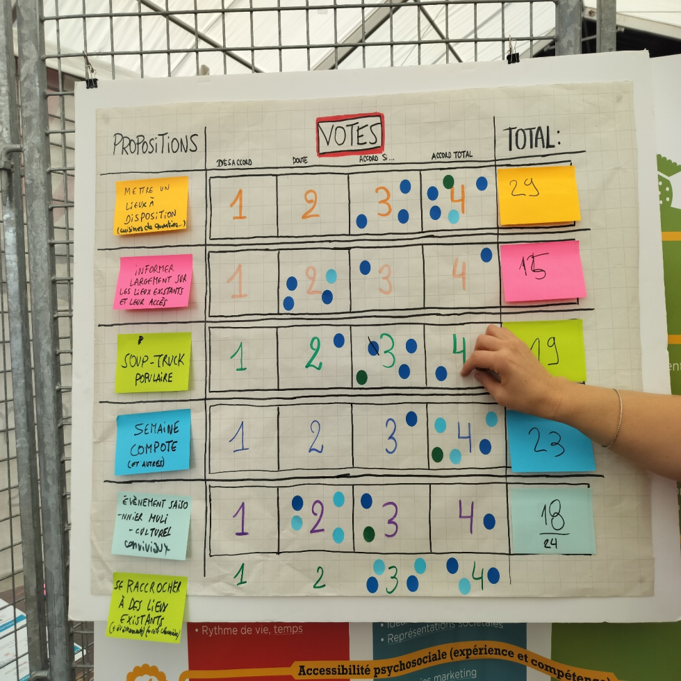 Les idées ne manquent pas : soupe-truck populaire au milieu de la place, mise à disposition de lieux pour faire des cuisines de quartier, se raccrocher à lieux existants, appels à oser dans les quartiers (pour logistique,etc, …) ; semaine compote collective pendant la saison des pommes, etc. Une dizaine d’idées qui passent ensuite à la moulinette du préférendum ….chacun est invité à donner une cote de 1 à 5 pour chaque proposition permettant ainsi de dégager celles qui sont les plus appréciées….